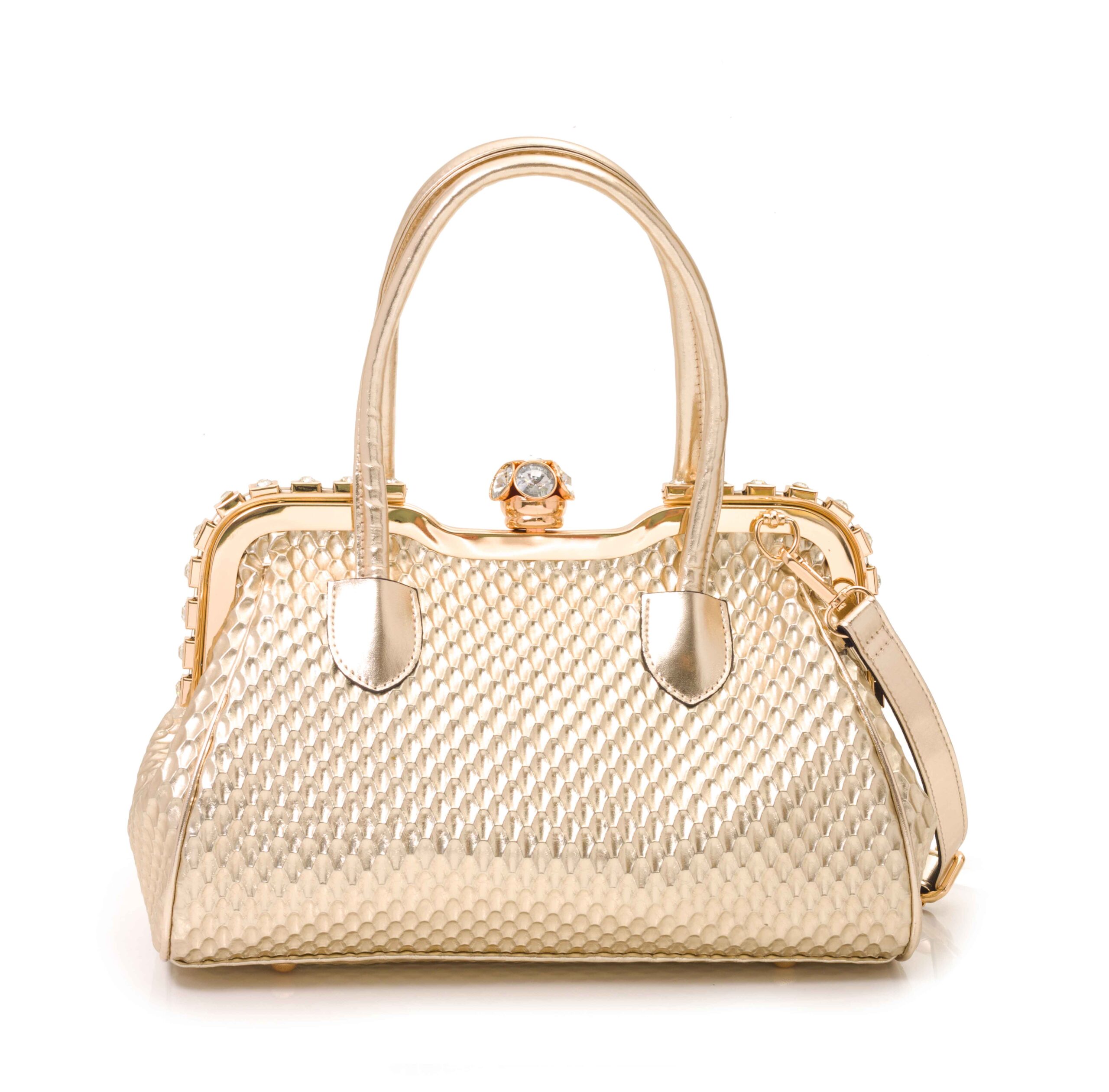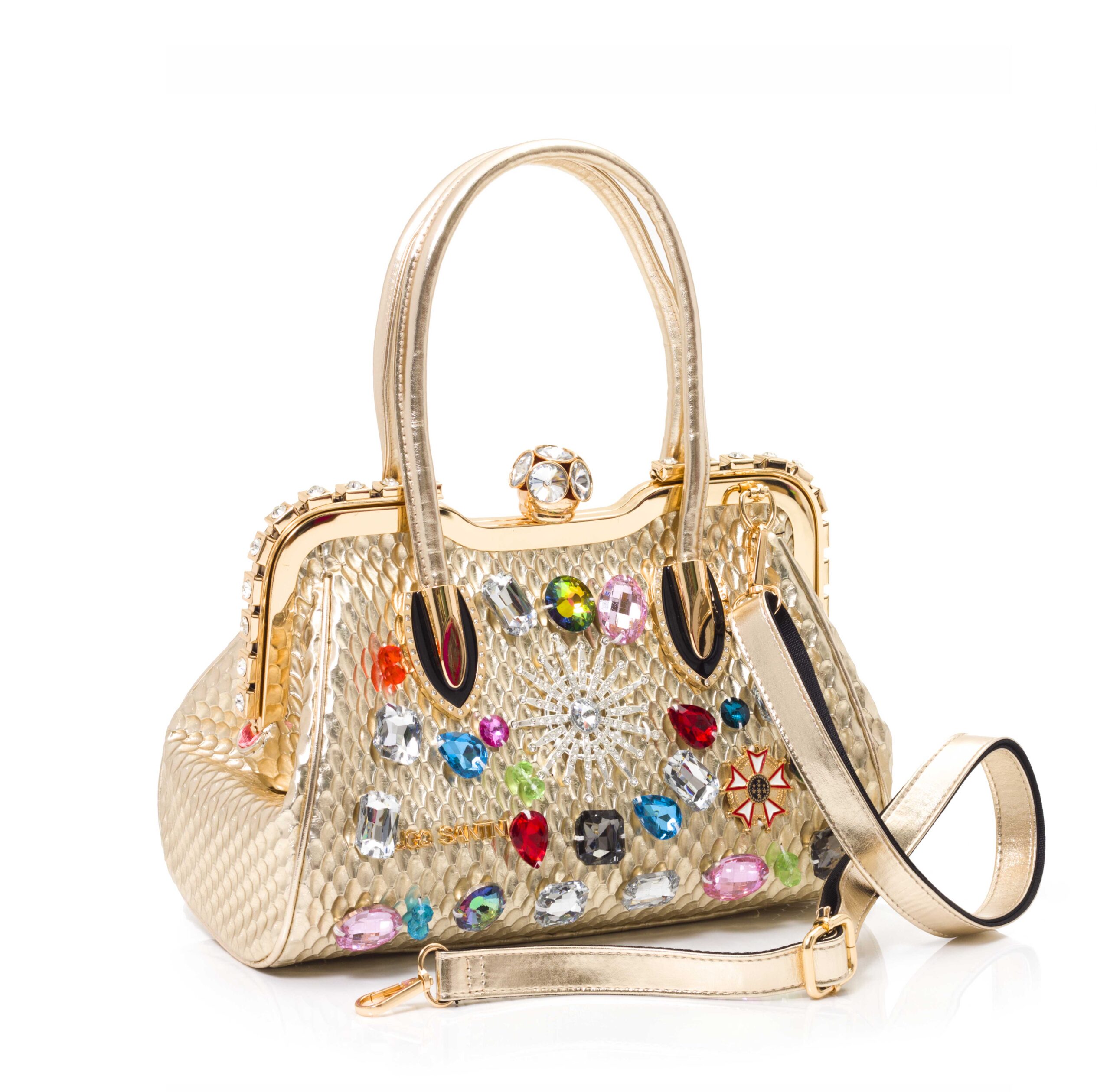 Cartera de cuero sintético trabajado con apliques y logo en relieve de la firma. Herrajes color oro y broche cierre con diseño. Asa de hombro en cuero sintético con metal y asa desmontable larga de cuero sintético.