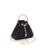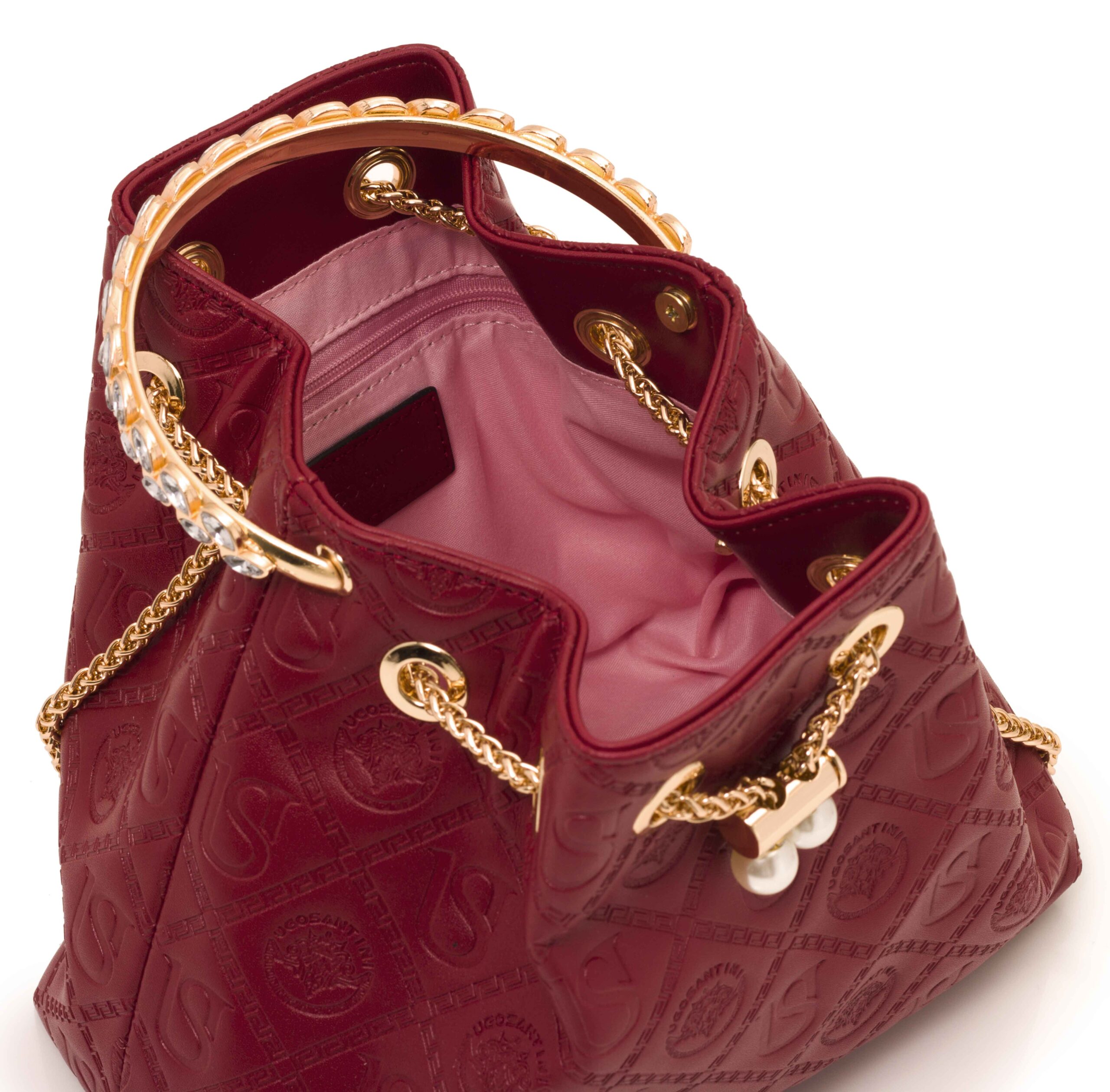 Cartera de cuero sintético trabajado con logo en relieve de la firma. Herrajes color oro y manija corta con diseño. Cierre de cadena con perlas. Asa de mano trabajada con strass perlados brillantes.