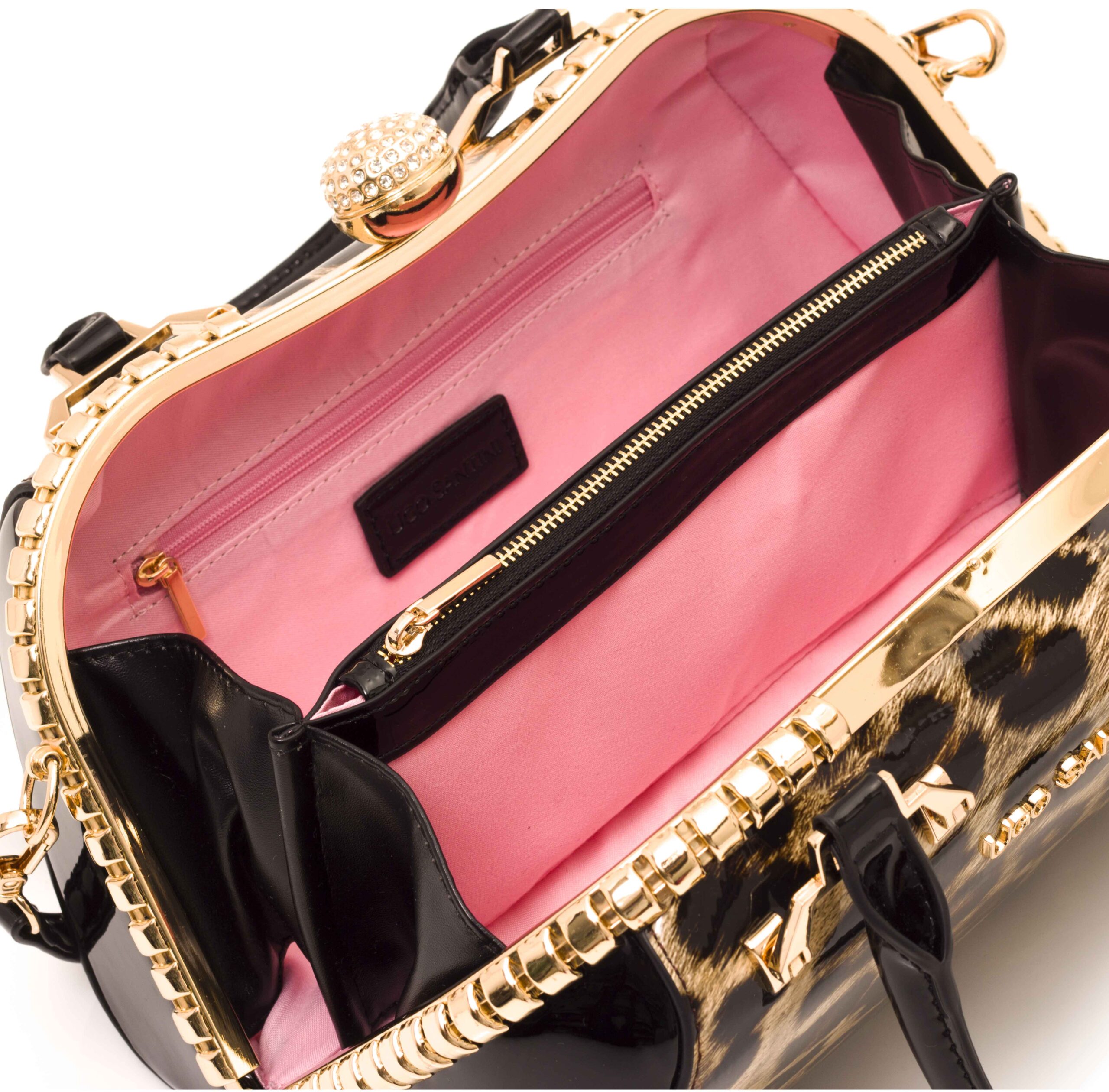 Cartera cuero sintético charolado con logo de la firma. Herrajes color oro con cierre fantasía. Asa de hombro y correa extraíble en cuero sintético con metal .