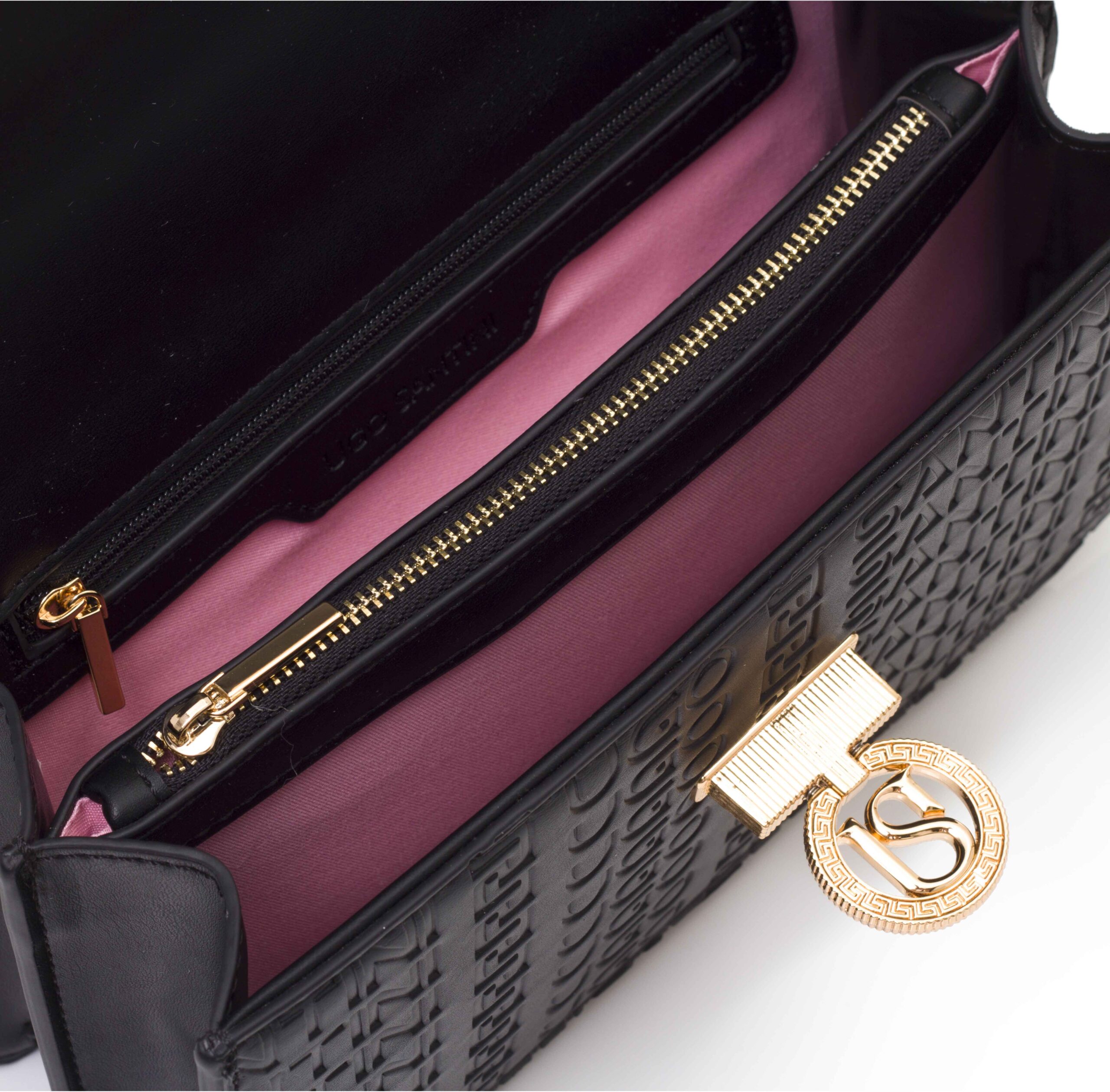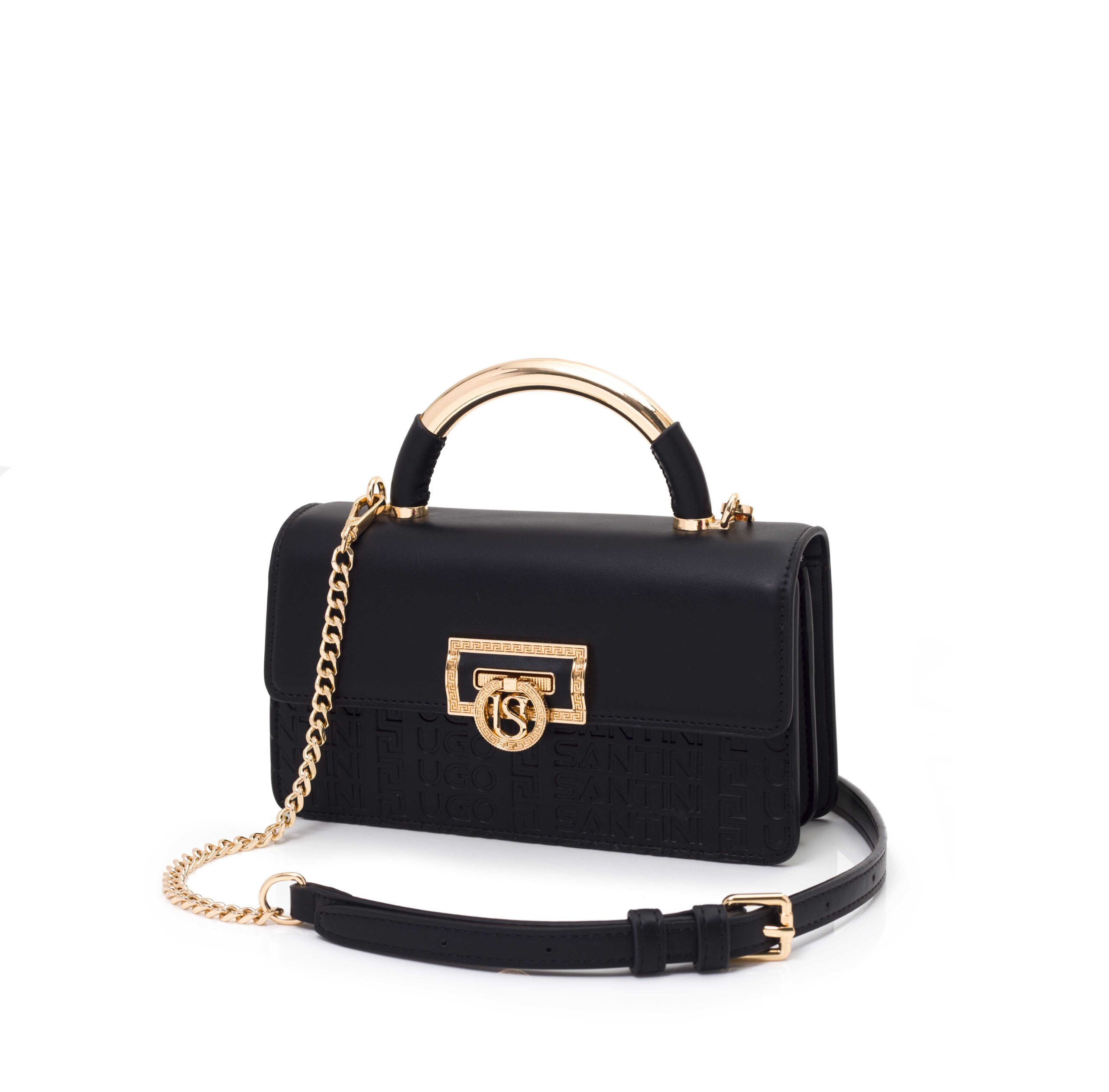 Cartera de cuero sintético trabajado con logo en relieve de la firma. Herrajes color oro y manija corta con diseño. Cierre con diseño exclusivo. Asa de mano trabajada y desmontable del mismo material.